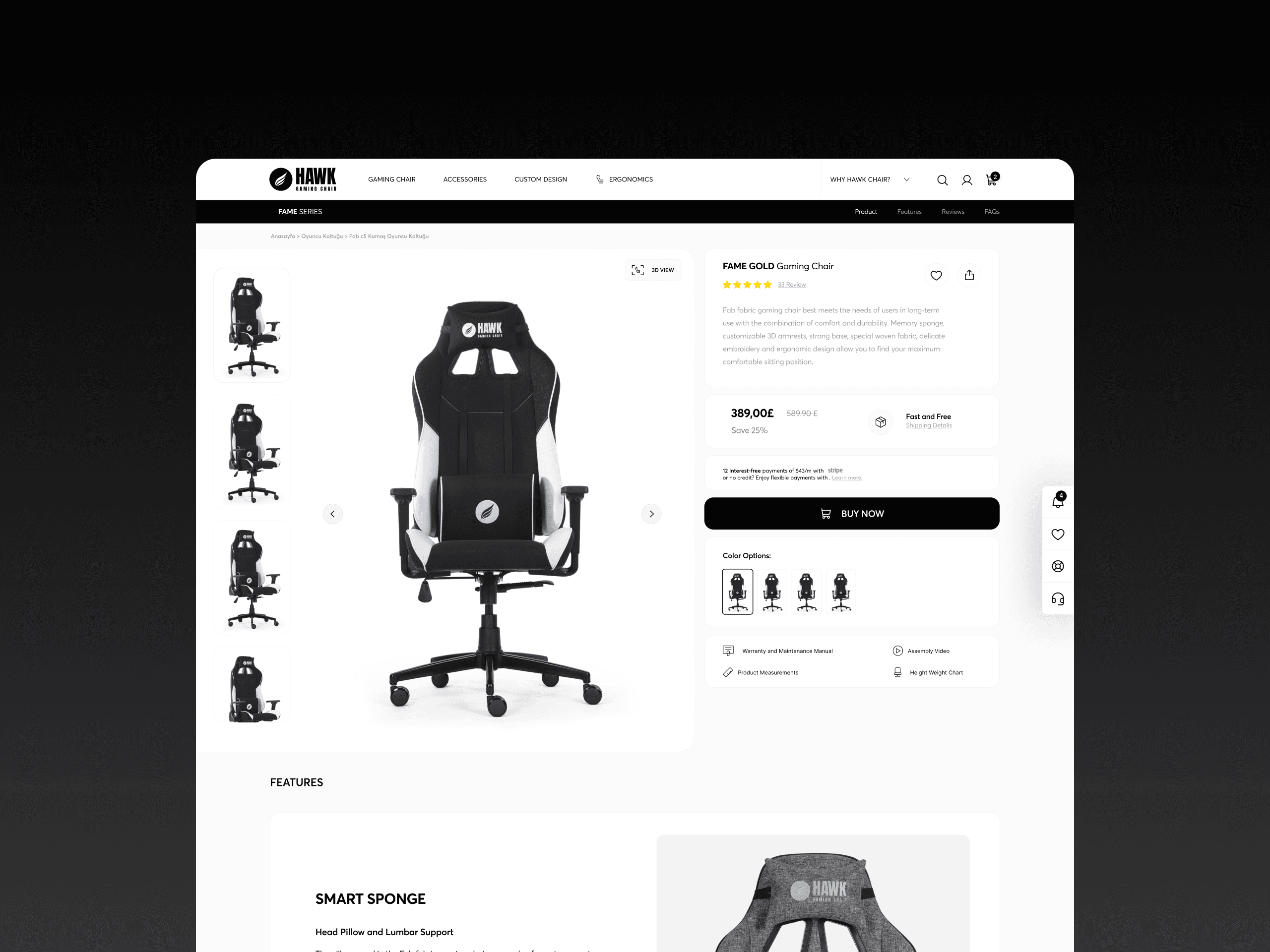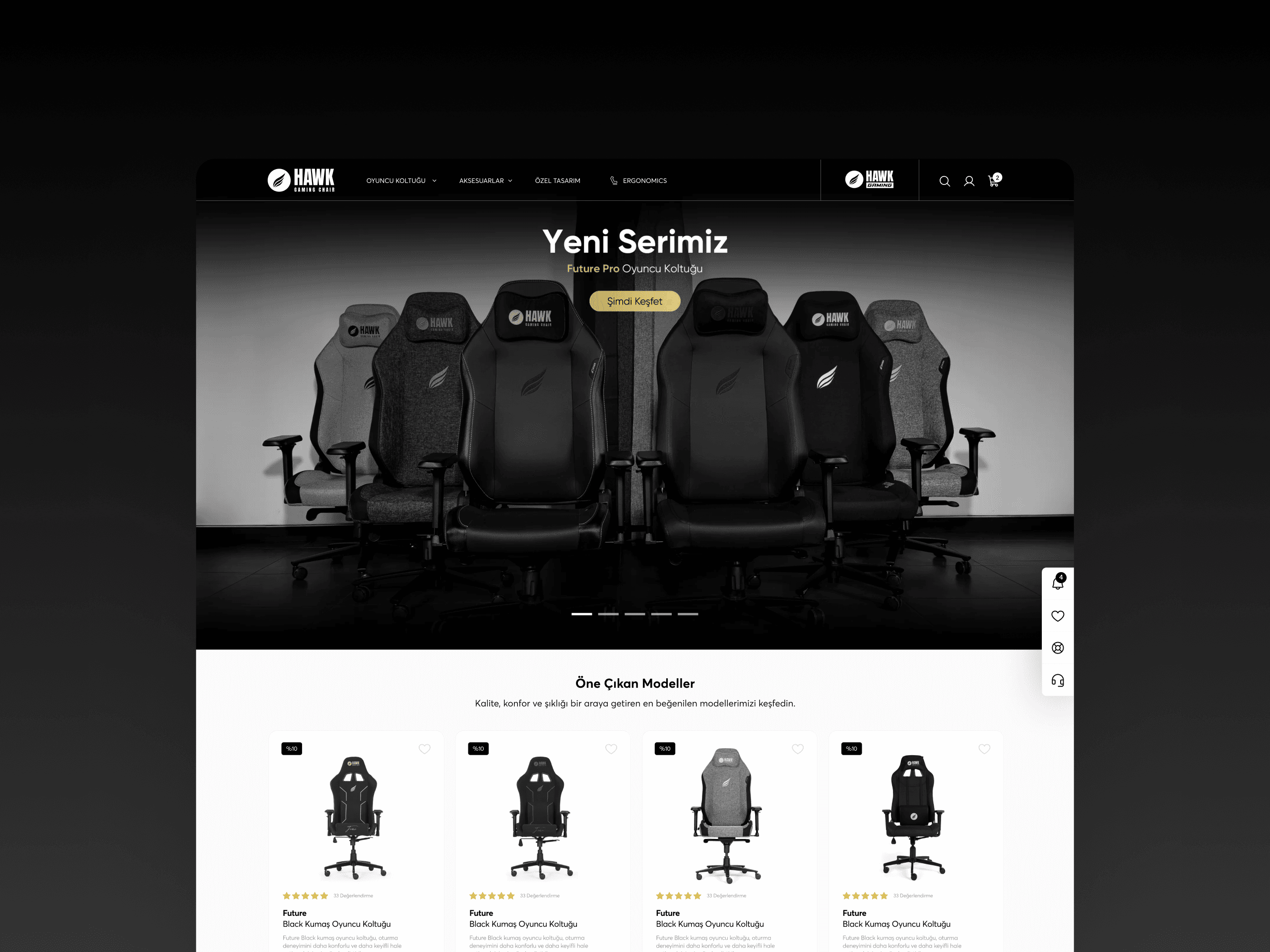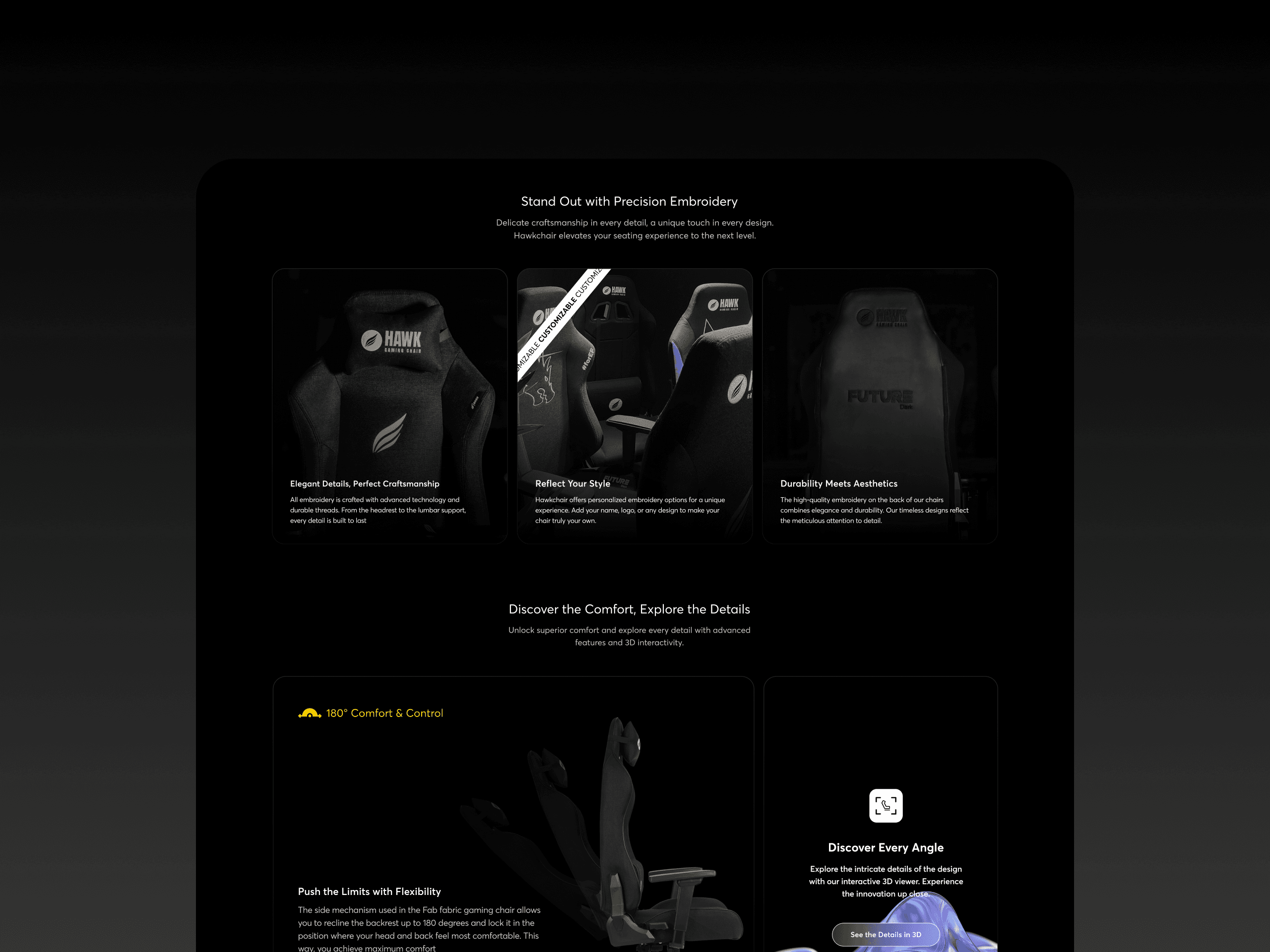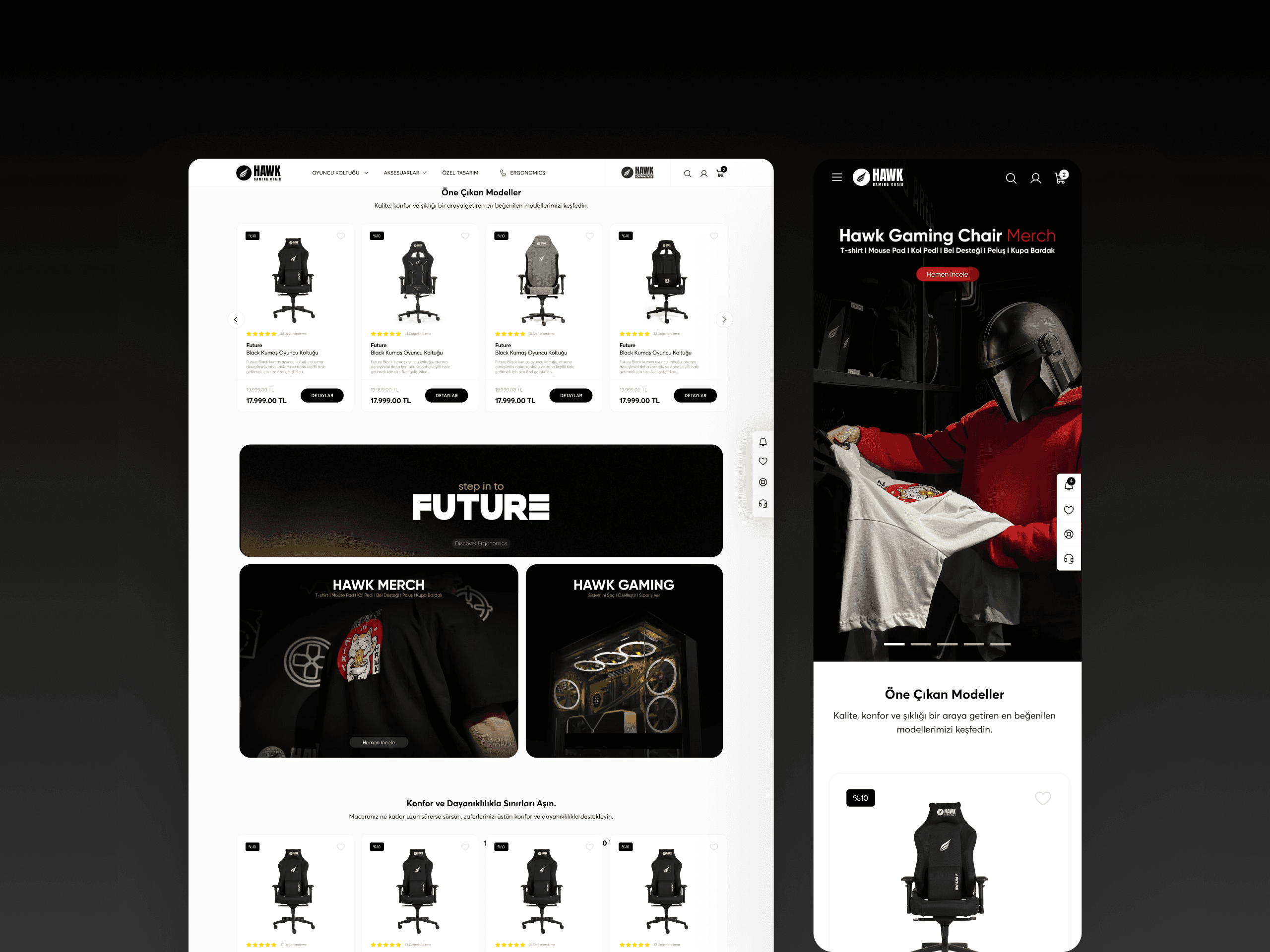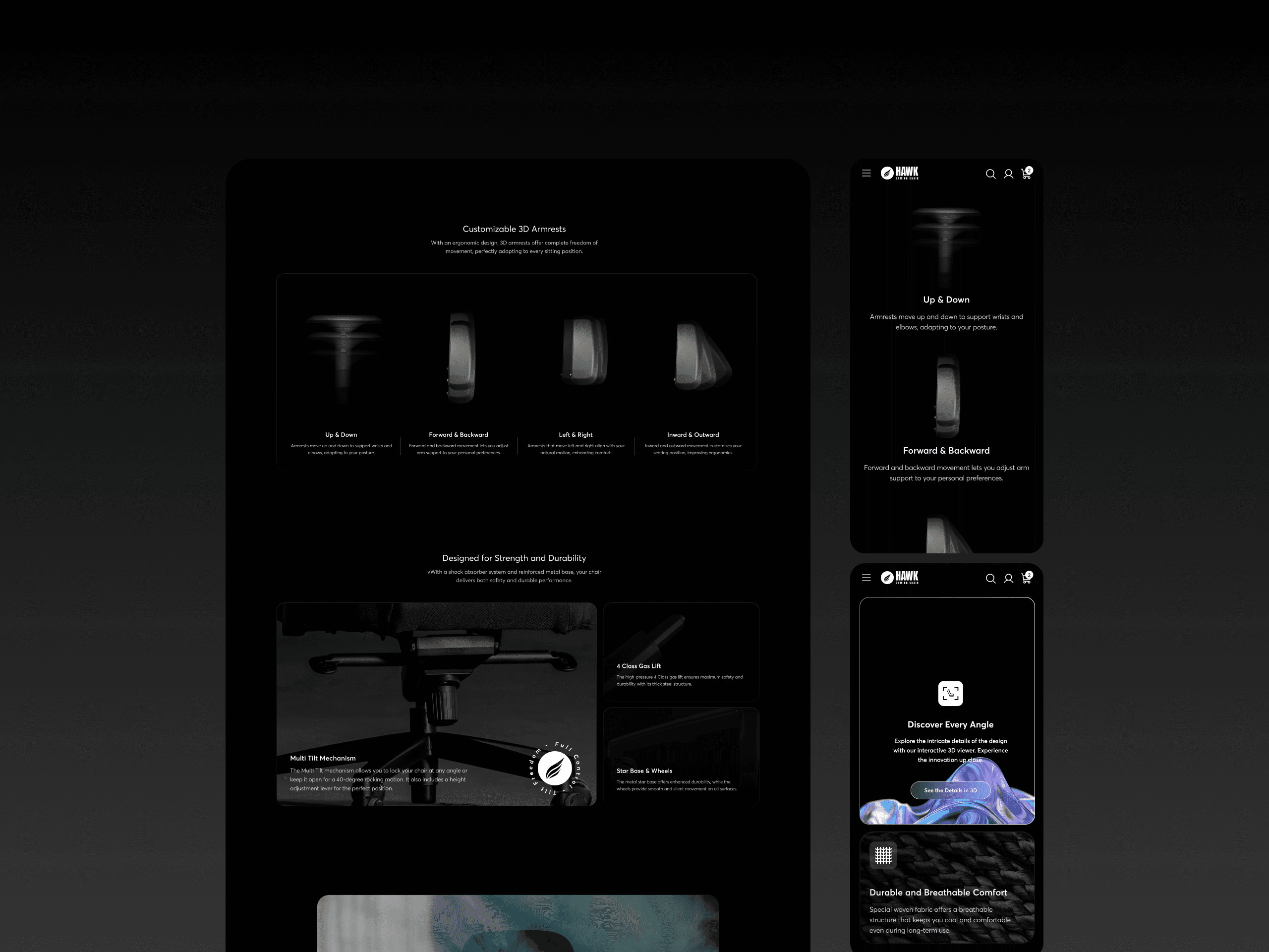 A new-generation e-commerce experience for Hawk Chair, a gaming chair brand blending ergonomic design with lifestyle appeal. The redesign highlights community trust — integrating influencer showcases, gamer feedback, and social content to drive engagement and credibility.